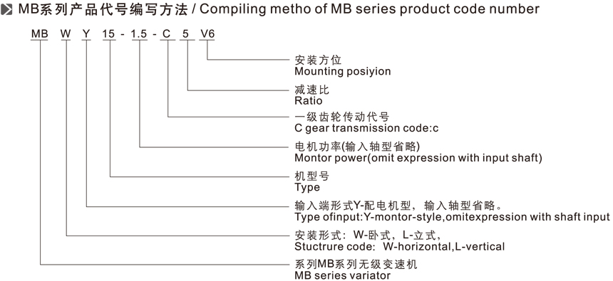 MB系列無(wú)級(jí)變速機(jī)代號(hào)編寫(xiě)方法有:MB W Y 15 - 1.5 - C 5 V6